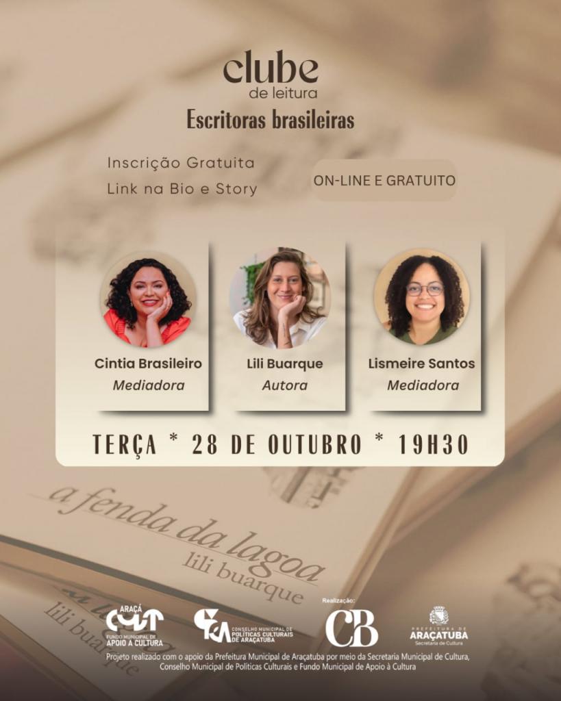 Este projeto foi contemplado no Edital de Chamamento Público nº 014/2024. O Clube de Leitura: Escritoras Brasileiras é um projeto idealizado por Cintia Brasileiro e realizado com o apoio da Prefeitura Municipal de Araçatuba, através da Secretaria Municipal de Cultura, do Conselho Municipal de Políticas Culturais e do Fundo Municipal de Apoio à Cultura.