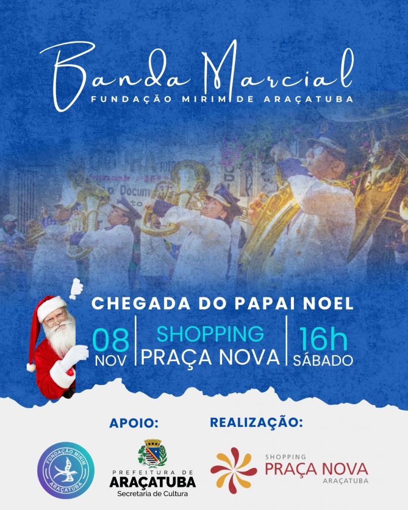 A magia do Natal vai invadir o Shopping Praça Nova Araçatuba no próximo dia 8 de novembro, a partir das 16h, com a tradicional chegada do Papai Noel. E quem dará o tom de alegria e emoção neste momento será a Banda Marcial do Ponto de Cultura da Fundação Mirim de Araçatuba, que fará uma apresentação especial para recepcionar o bom velhinho e encantar o público presente.