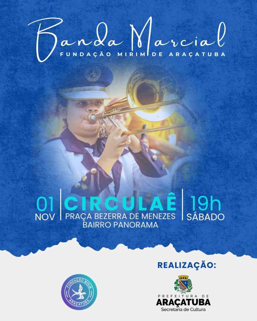 A Banda Marcial do Ponto de Cultura da Fundação Mirim de Araçatuba, será uma das atrações do Circulaê que acontece no próximo dia 1º de novembro, a partir das 19h, na Praça Bezerra de Menezes, no bairro Panorama. A Banda Marcial promete animar o público com uma apresentação repleta de energia, destacando o talento dos jovens integrantes.
