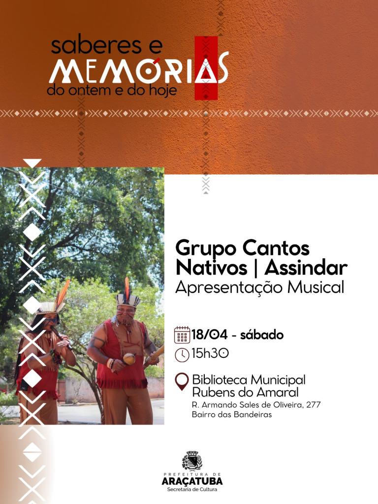 O grupo musical da Assindar - Associação Indigenista de Araçatuba e Região – realiza uma apresentação instrumental que convida o público a vivenciar, por meio dos sons, a riqueza das culturas indígenas.
