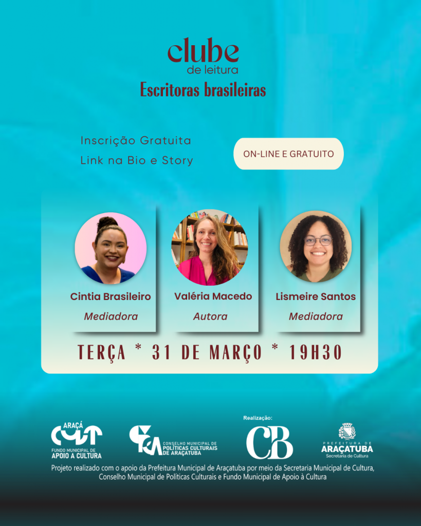 Este projeto foi contemplado no Edital de Chamamento Público nº 014/2024. O Clube de Leitura Escritoras Brasileiras é um projeto idealizado por Cintia Brasileiro e realizado com o apoio da Prefeitura Municipal de Araçatuba, através da Secretaria Municipal de Cultura, do Conselho Municipal de Políticas Culturais e do Fundo Municipal de Apoio à Cultura.