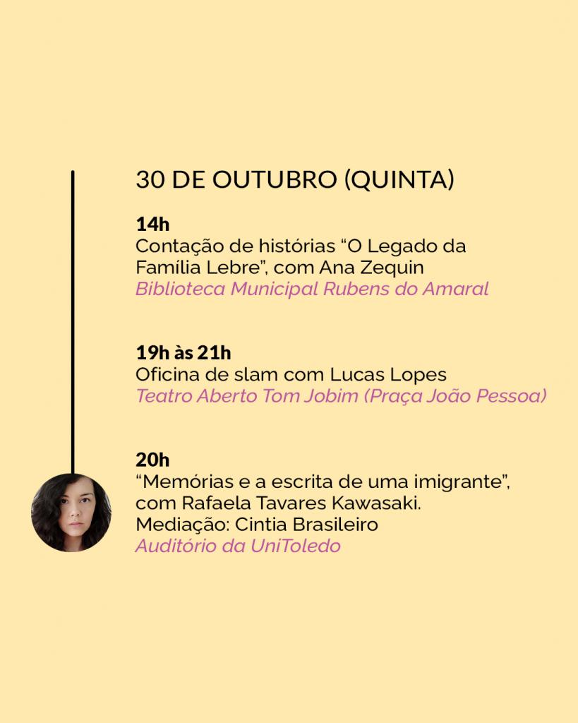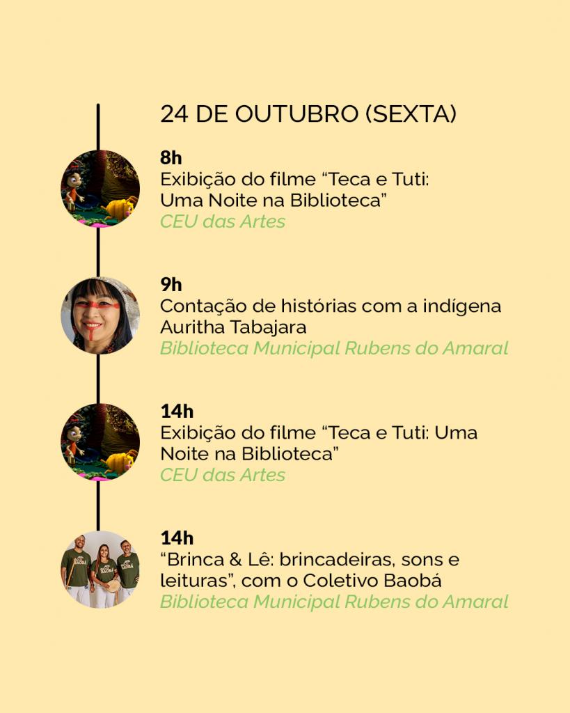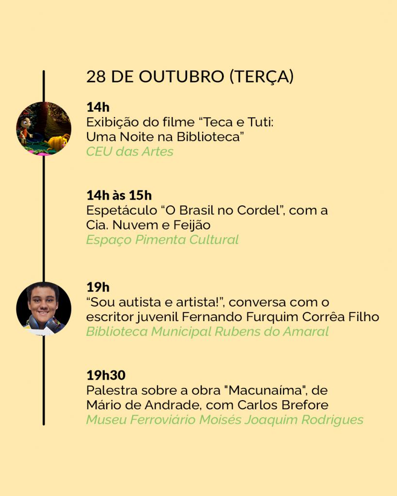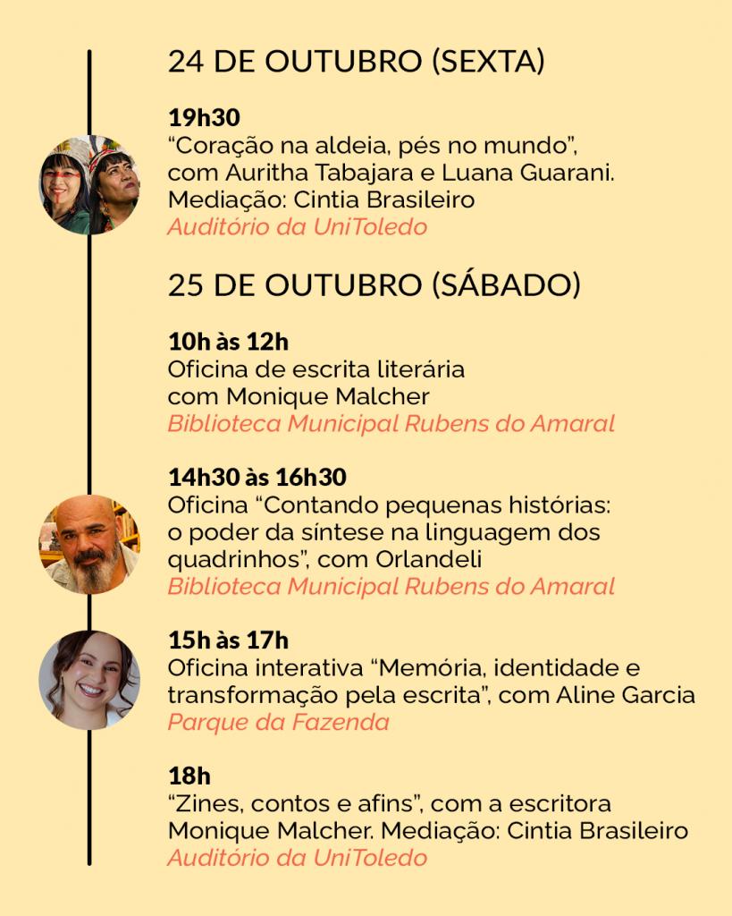 A 8ª edição do festival acontecerá entre os dias 23 e 31 de outubro, tendo sua abertura oficial dia 22, às 19h30, na Biblioteca Municipal Rubens do Amaral, com coquetel de recepção e apresentação da Banda Municipal Bruno Zago, e às 20h início da solenidade, e a mesa redonda com o premiado escritor indígena Daniel Munduruku, com mediação de Rafaela Cândido.