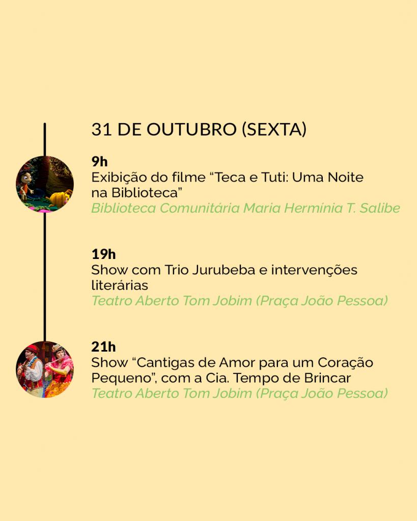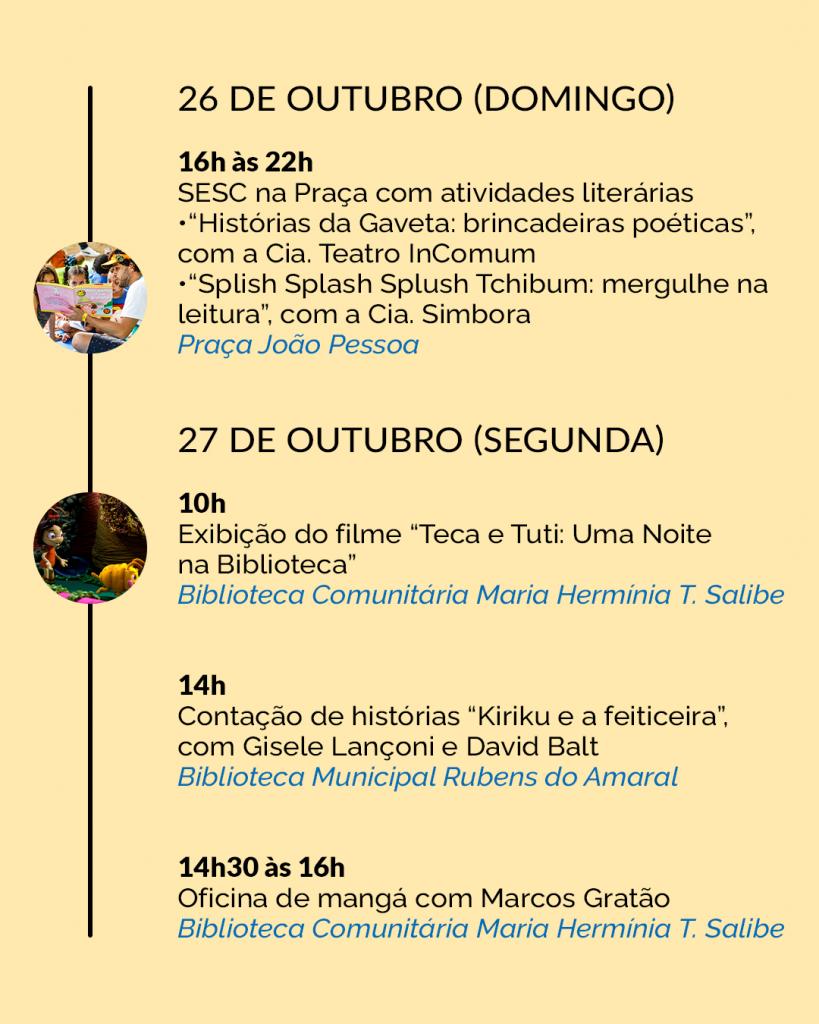 A programação conta com banca de troca de livros, palestras, oficinas, contação de histórias, saraus e performances, espetáculos teatrais, exposições, lançamento de livros, rodas de conversa, sessões de cinema, shows. Diversos locais do município receberão as atividades, como escolas municipais e estaduais, bibliotecas, pontos de cultura, praça, faculdades, entre outros. Nenhuma atividade necessita inscrição prévia.