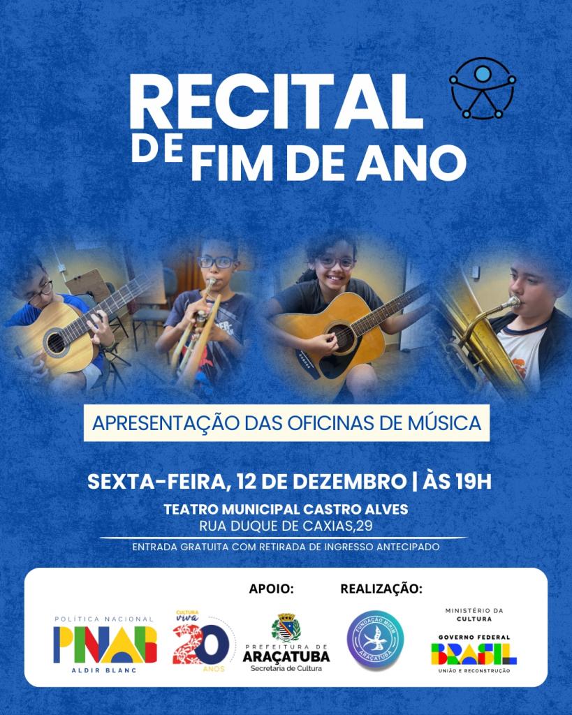 O Ponto de Cultura da Fundação Mirim de Araçatuba realiza, no dia 12 de dezembro, às 19h no Teatro Castro Alves, o Recital de Encerramento das Oficinas de Música. O recital contará com apresentações dos alunos das oficinas de violão, além das oficinas de sopros e percussão. O evento tem por objetivo demonstrar aos familiares e a comunidade os resultados alcançados no processo formativo construído ao decorrer do ano.