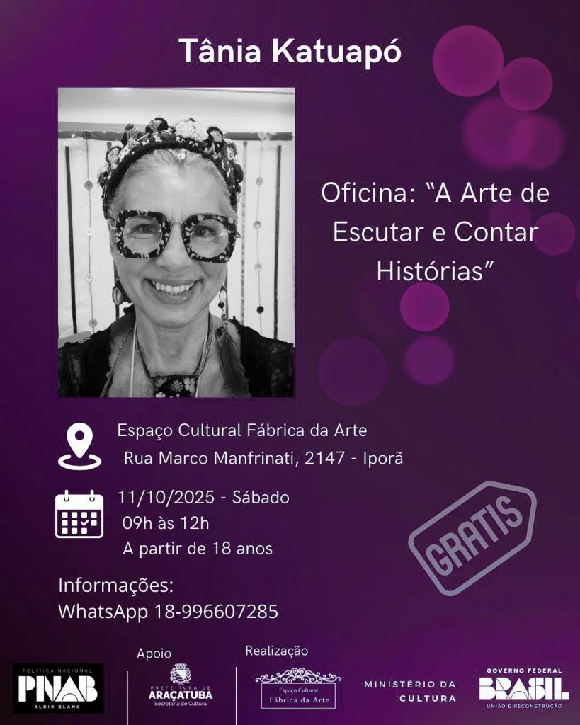 No sábado (11), a contadora de histórias Tânia Katuapó vai ministrar a oficina “A arte de escutar e contar histórias”, das 9h às 12h, no Espaço Cultural Fábrica da Arte. O público-alvo são professores, artistas, contadores de histórias e demais interessados a partir de 18 anos.