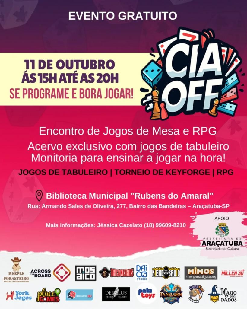 Ainda no sábado, a Biblioteca Municipal Rubens do Amaral recebe, das 15h às 20h, o encontro de jogos de tabuleiro modernos e RPG com a Cia. OFF. Um evento é gratuito, inclusivo e cheio de oportunidades para diversão, aprendizado e interação, com explicações e apoio para iniciantes e veteranos.