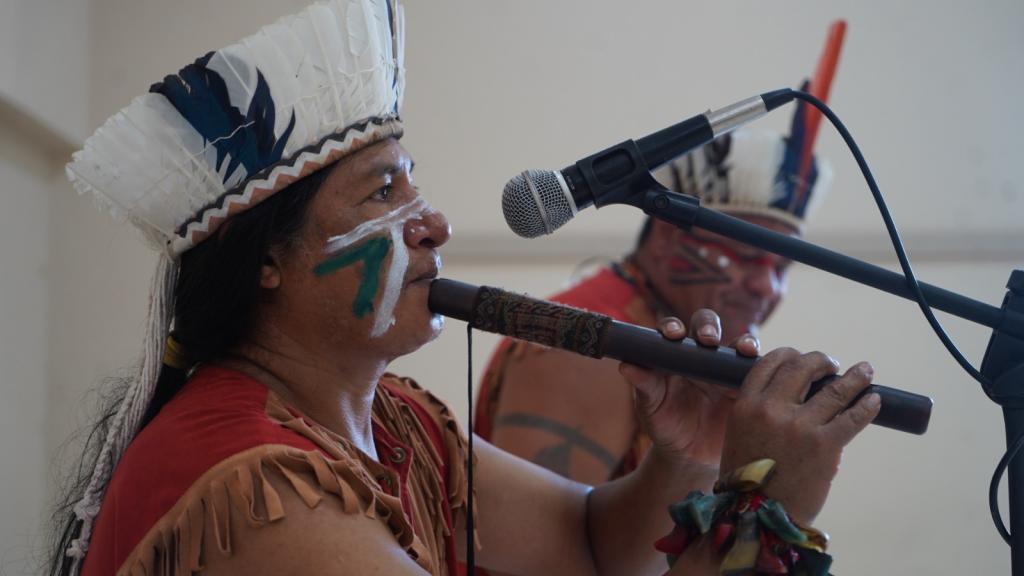 Os artistas Ricardo Terena e Amaru Kichwa fizeram uma apresentação a alunos da Escola Municipal de Educação Básica (Emeb) Leonisía de Castro. Utilizando instrumentos tradicionais dos povos originários, a dupla criou uma atmosfera sensorial, aproximando as crianças da cultura indígena.