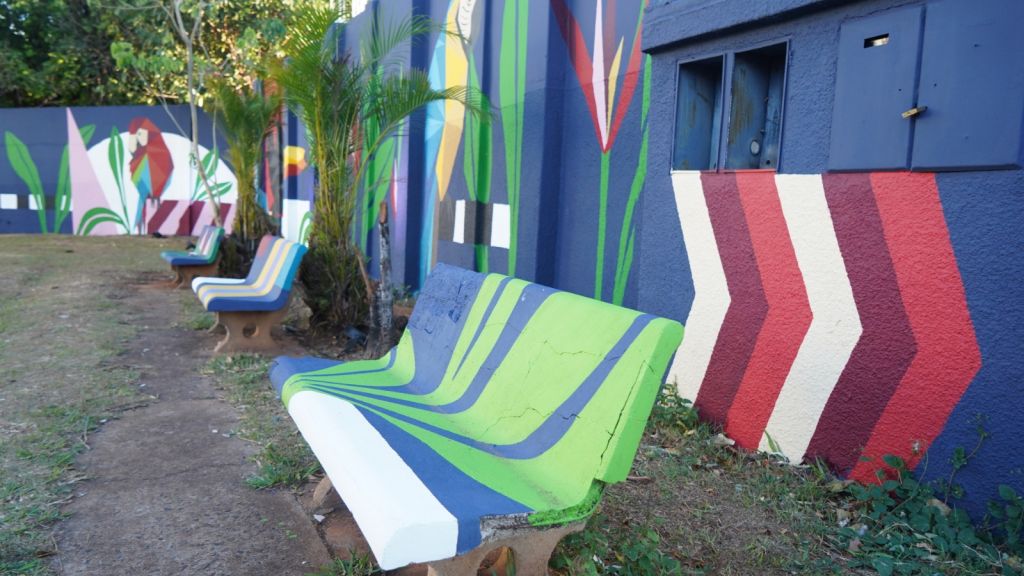 As obras traduzem em cores e formas a história e a identidade cultural da cidade, transformando os ginásios em espaços de encontro e convivência.