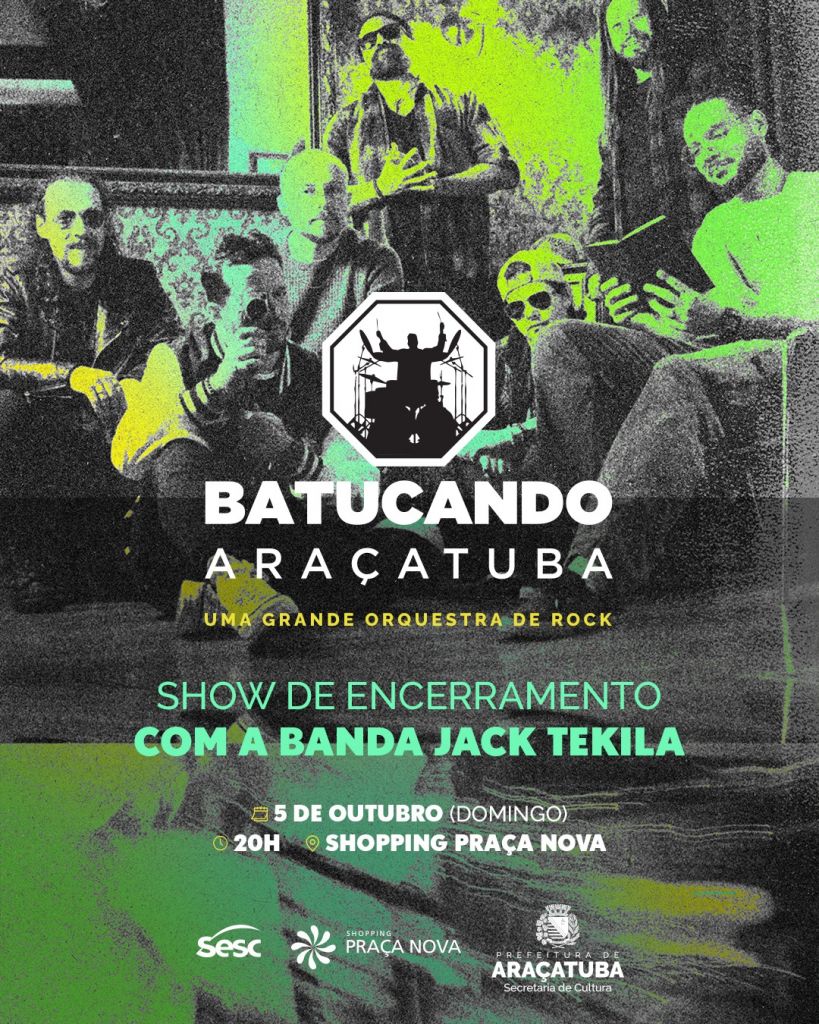 O Batucando Araçatuba será encerrado com a banda Jack Tekila, às 20h, que apresentará clássicos de Titãs, Paralamas, Capital Inicial, Ira! e Cidade Negra, além de releituras de Tim Maia, Gilberto Gil e Cássia Eller. O repertório também inclui músicas autorais do álbum De Leve, como Algo Parecido e 2A.