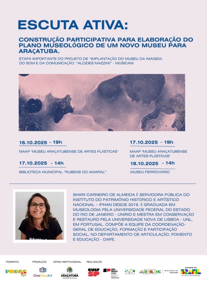 A CineEducArt, empresa que atua na área de arte e cultura, realizará, entre os dias 16 e 18 deste mês, quatro encontros visando ouvir a população na elaboração do Plano Museológico para a implantação do Museu da Imagem, Som e Comunicação Alcides Mazzini (Musicam) de Araçatuba.