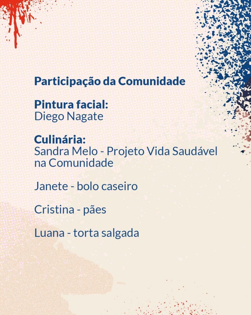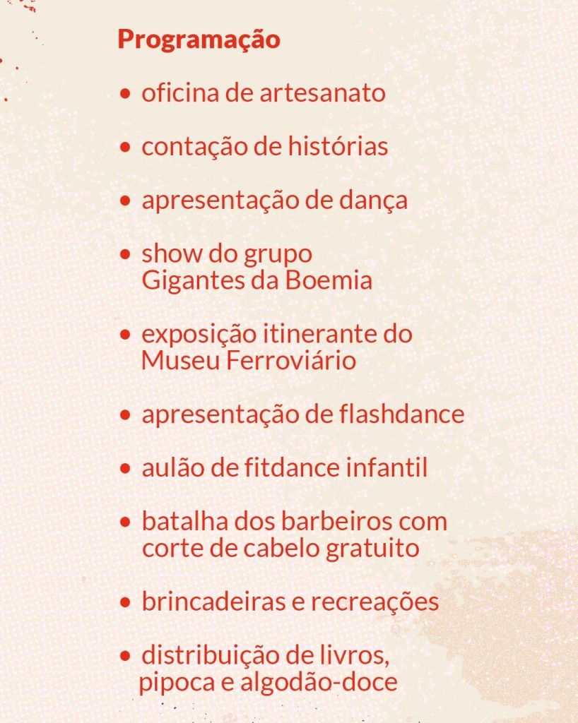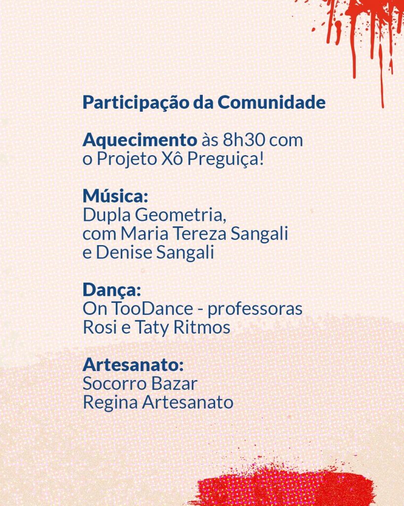Haverá ainda show do grupo Gigantes da Boemia, contação de histórias com Katuapó Conta Histórias, apresentação de dança do projeto On TooDance, flashdance com o professor Reni Alves e aulão de fitdance infantil com o professor Henry Miller.