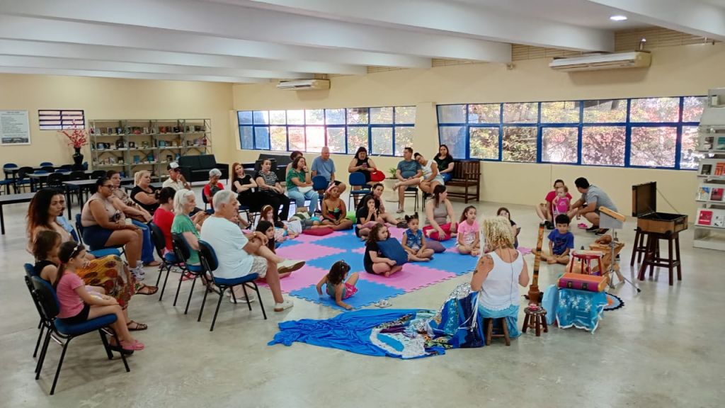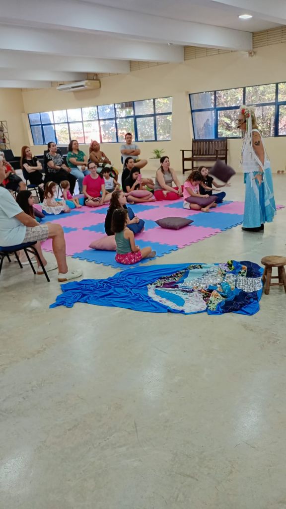 O encontro reuniu crianças e adultos em torno da arte-educadora Katuapó Conta Histórias, que conduziu uma narrativa lúdica tendo a água como elemento central.