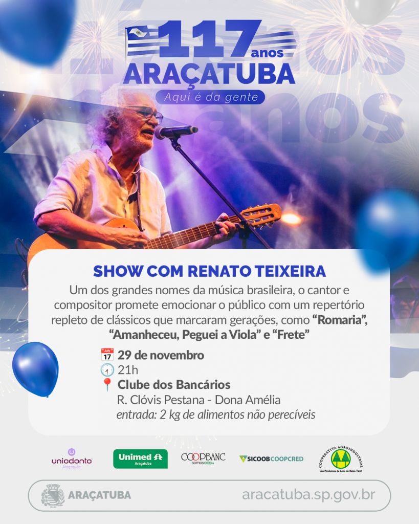 A noite deste sábado (29), em Araçatuba, reserva mais um grande evento que celebra o aniversário de 117 anos da cidade. O show de Renato Teixeira promete lotar o Clube dos Bancários, a partir das 21h.