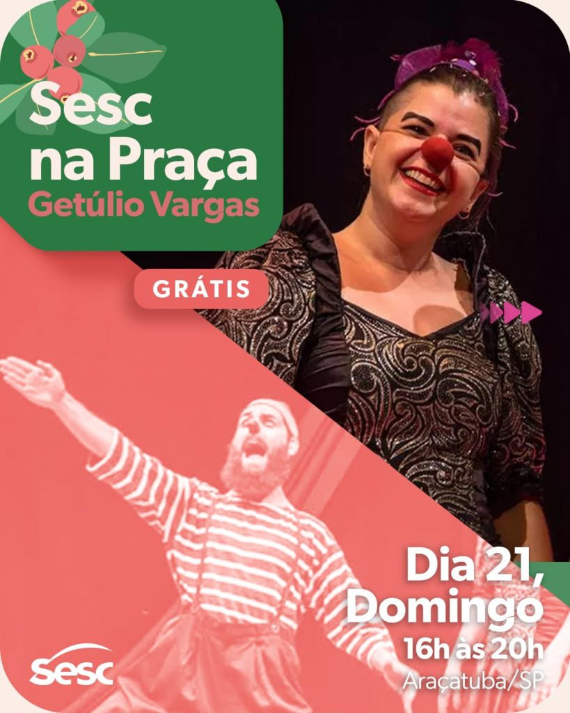 A Praça Getúlio Vargas, em Araçatuba, recebe neste domingo (21), das 16h às 20h, o projeto Sesc na Praça. Será uma ação repleta de experiências culturais, artísticas e esportivas gratuitas para toda a família, com a realização de uma oficina e espetáculo circense.