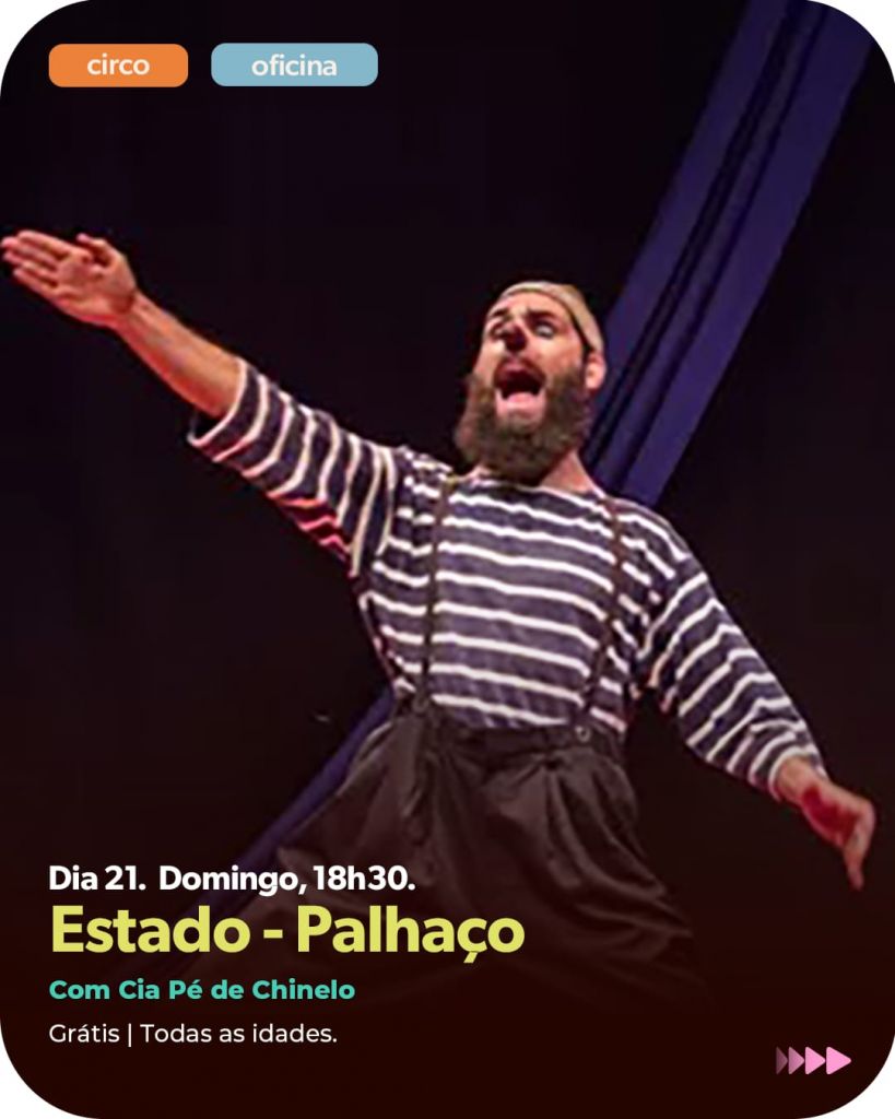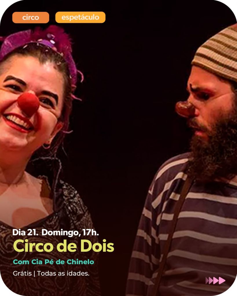 A partir das 17h, a Cia. Pé de Chinelo apresenta o espetáculo circense “Circo de Dois”. Entre atrapalhadas e acrobacias, dois palhaços dividem o picadeiro e os desafios da vida, em uma apresentação repleta de humor, poesia e improviso.