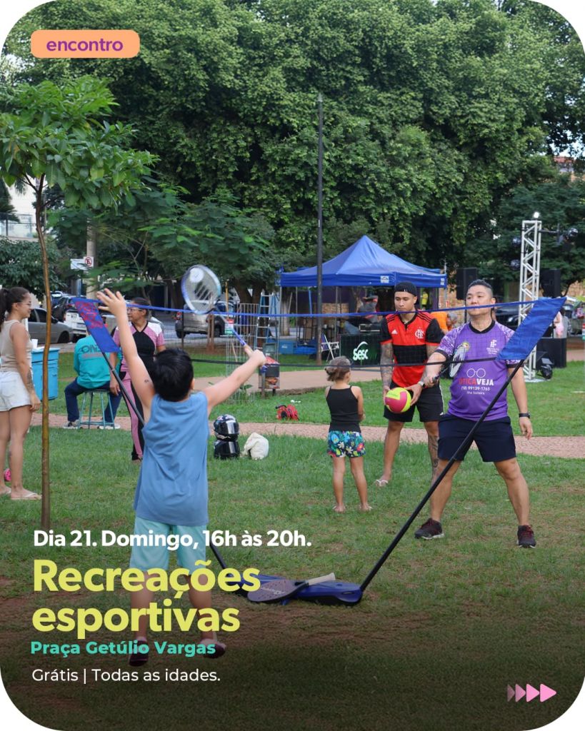 Durante todo o Sesc na Praça, o público poderá participar de atividades esportivas pensadas para todas as faixas etárias e níveis de habilidades. Haverá equipamentos como badminton, miniesportes, cornhole (conhecido como atira-saco), entre outros, com orientações de monitores.
