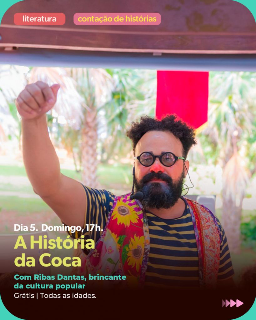 A partir das 17h, haverá a contação “A História da Coca”, com o Leonardo Ferigato. Nesta história, uma criança perdeu sua fruta encantada, mas foi recompensada com uma aventura cheia de personagens fantásticos da cultura popular, brincadeiras e cantigas que o povo canta.