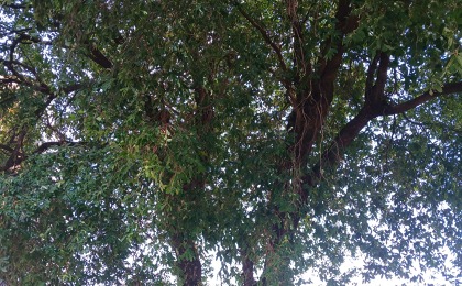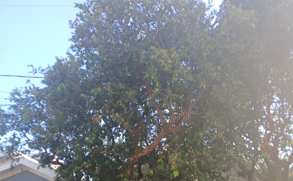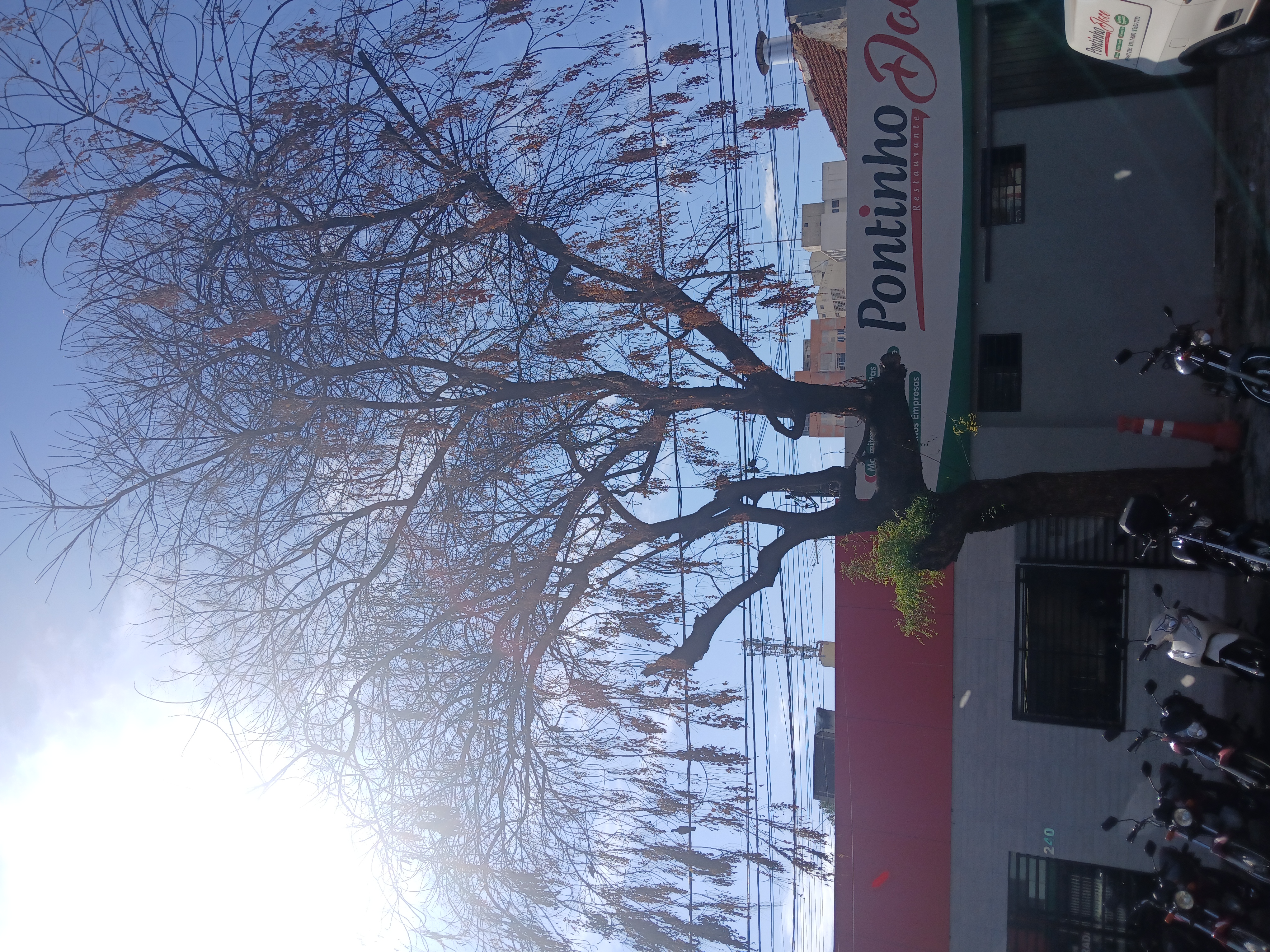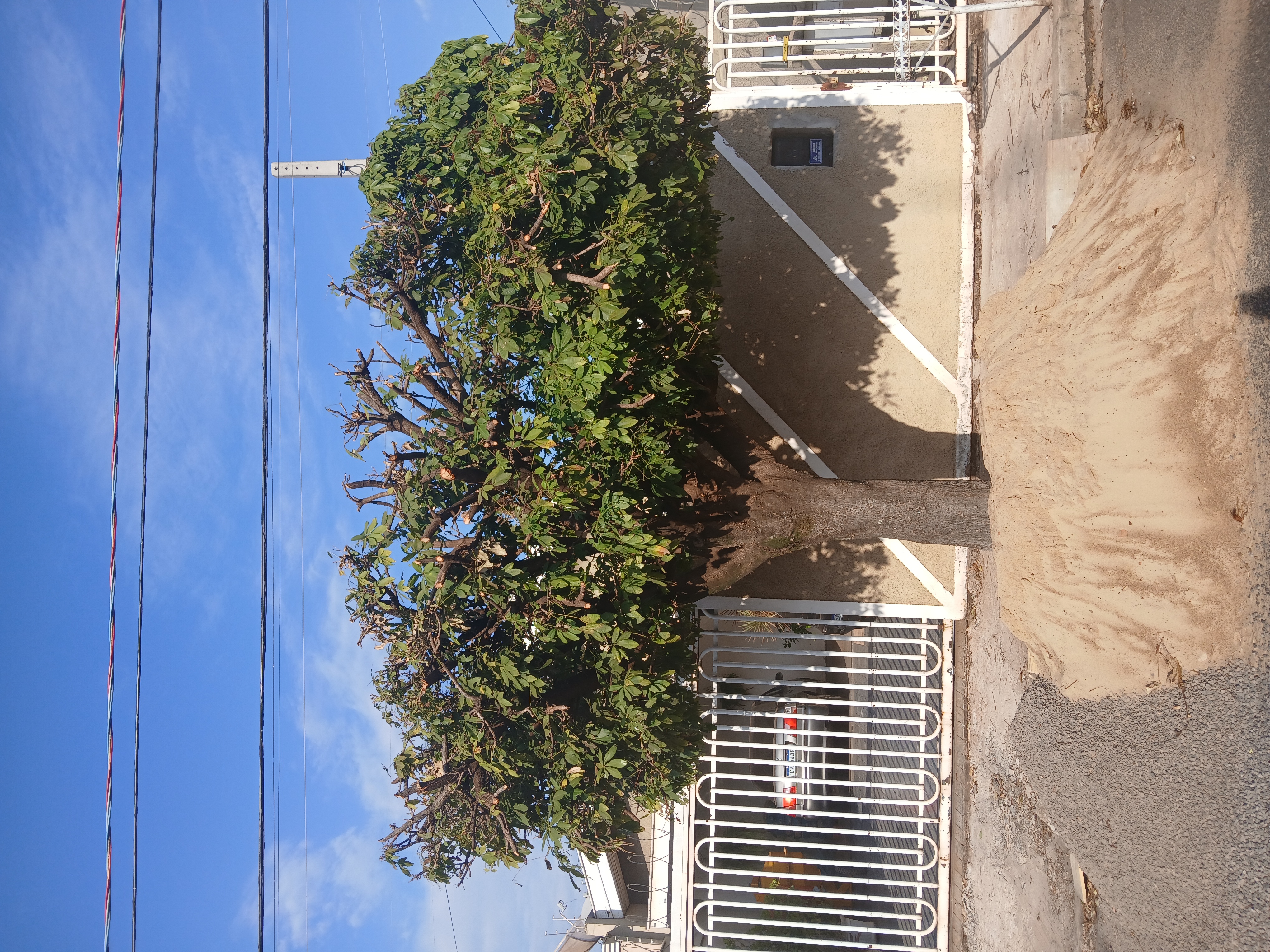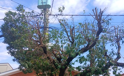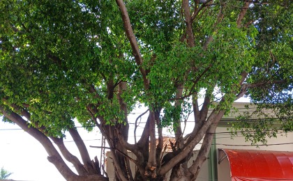 sarjeta. Árvore com altura maior do que o recomendado para o local, necessitando de podas drásticas para adequação.