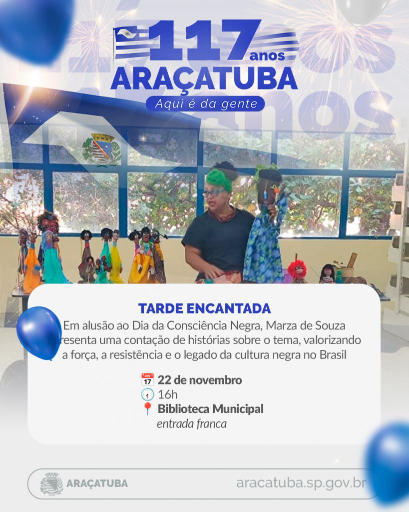 Neste sábado (22), a Biblioteca Municipal recebe a incrível Marza de Souza para uma tarde cheia de histórias que celebram a força, a beleza e o legado da cultura negra no Brasil.