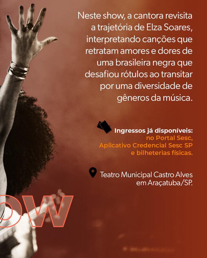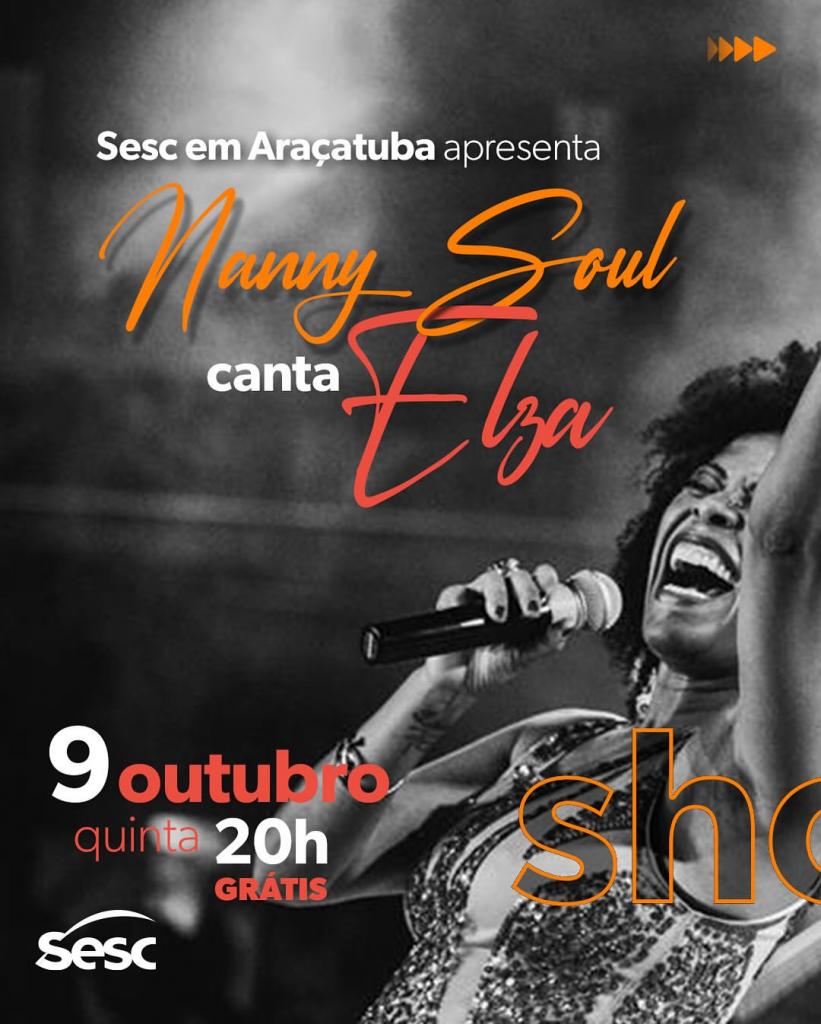 Araçatuba, na próxima quinta (9/10), às 20h, o Teatro Castro Alves recebe Nanny Soul canta Elza, espetáculo que percorre a trajetória da artista em canções que falam de amores, dores e da potência de uma brasileira que desafiou rótulos ao transitar por diferentes gêneros musicais.