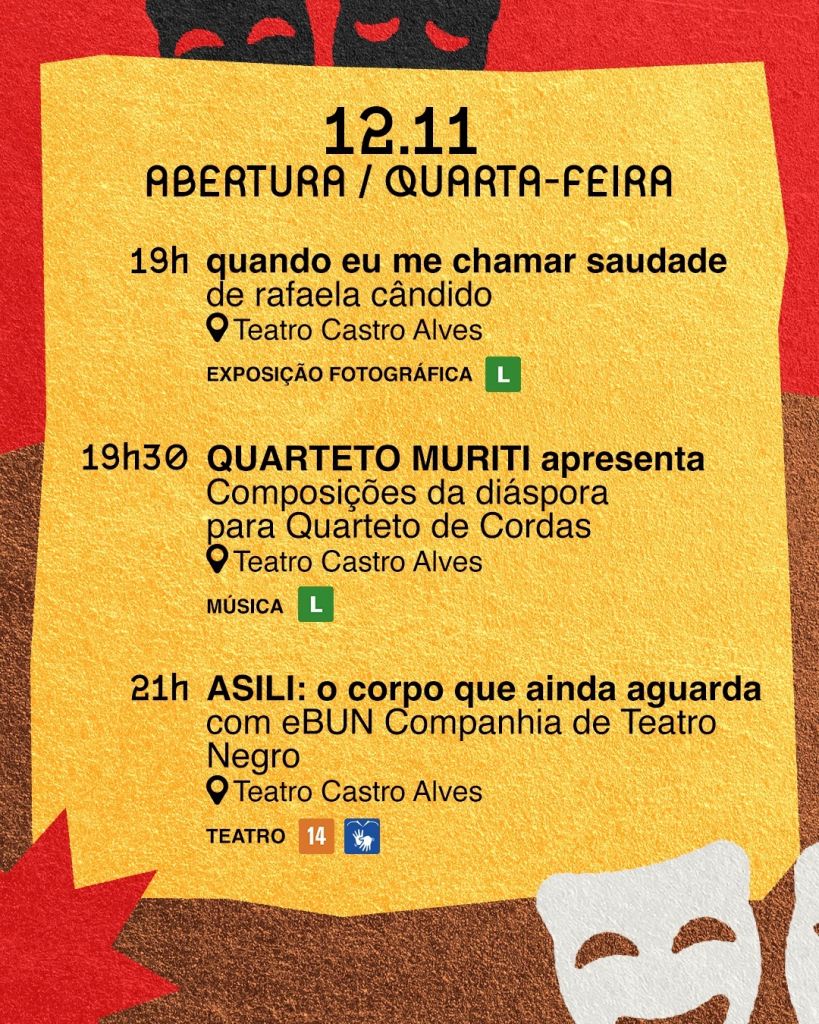 A programação do primeiro dia será no Teatro Castro Alves. Às 19h, haverá a exposição fotográfica “Quando eu me chamar saudade”, da gestora cultural Rafaela Cândido. A mostra reúne 49 fotografias que valorizam a trajetória, resistência e a sabedoria de sete pessoas negras com mais de 60 anos.