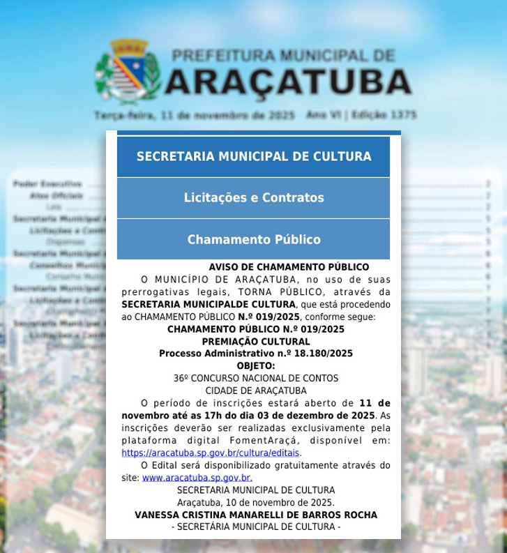 A Prefeitura de Araçatuba, por meio da Secretaria Municipal de Cultura, lançou o edital do 36º Concurso Nacional de Contos Cidade de Araçatuba. O prêmio é uma das ações literárias mais tradicionais do Interior Paulista, que reconhece e valoriza a literatura contemporânea brasileira.