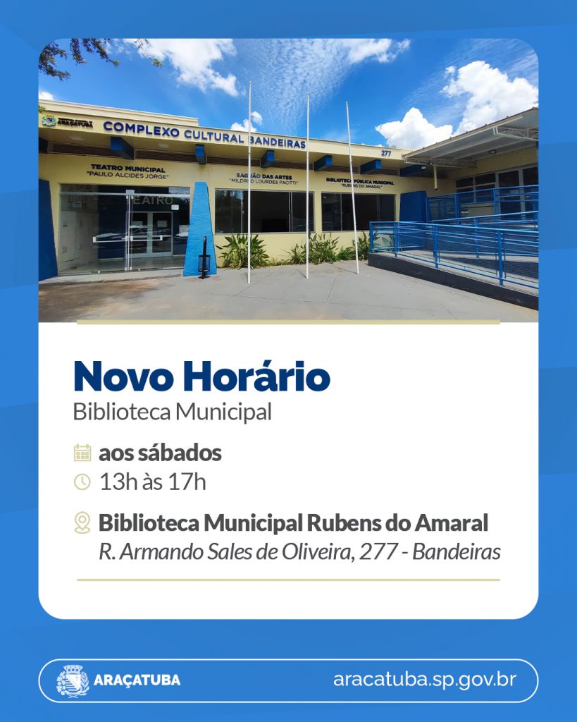 A partir deste 7 de junho, a Biblioteca Municipal Rubens do Amaral, em Araçatuba, passará a oferecer atendimento ao público também aos sábados, das 13h às 17h. A medida busca facilitar o acesso da população ao espaço cultural e incentivar o hábito da leitura, além de ampliar opções para estudos e pesquisa.