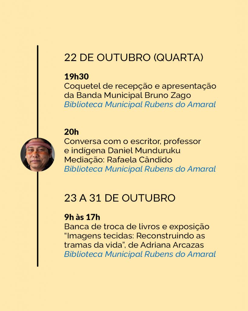 Na abertura, no dia 22, o Felita receberá o renomado escritor indígena Daniel Munduruku para um bate-papo na Biblioteca Municipal, às 20h. Autor de mais de 60 livros, as obras literárias são dirigidas ao público infantojuvenil, tendo como tema principal a diversidade cultural indígena.