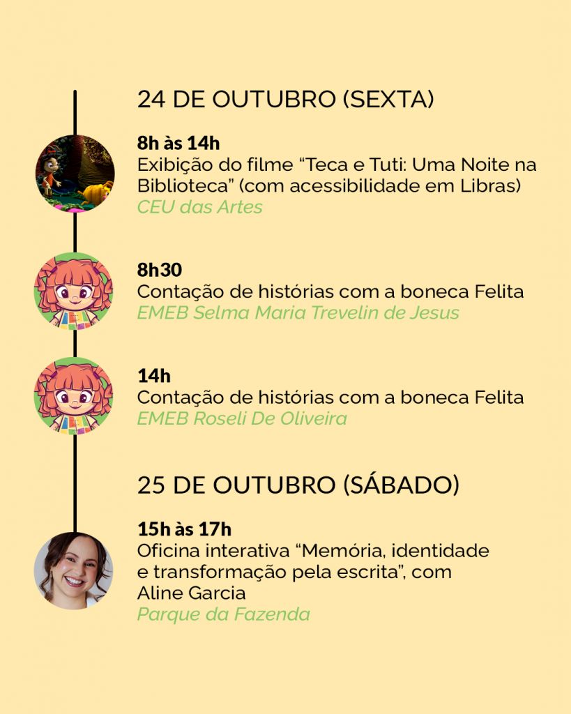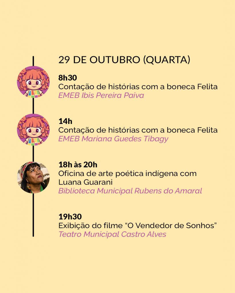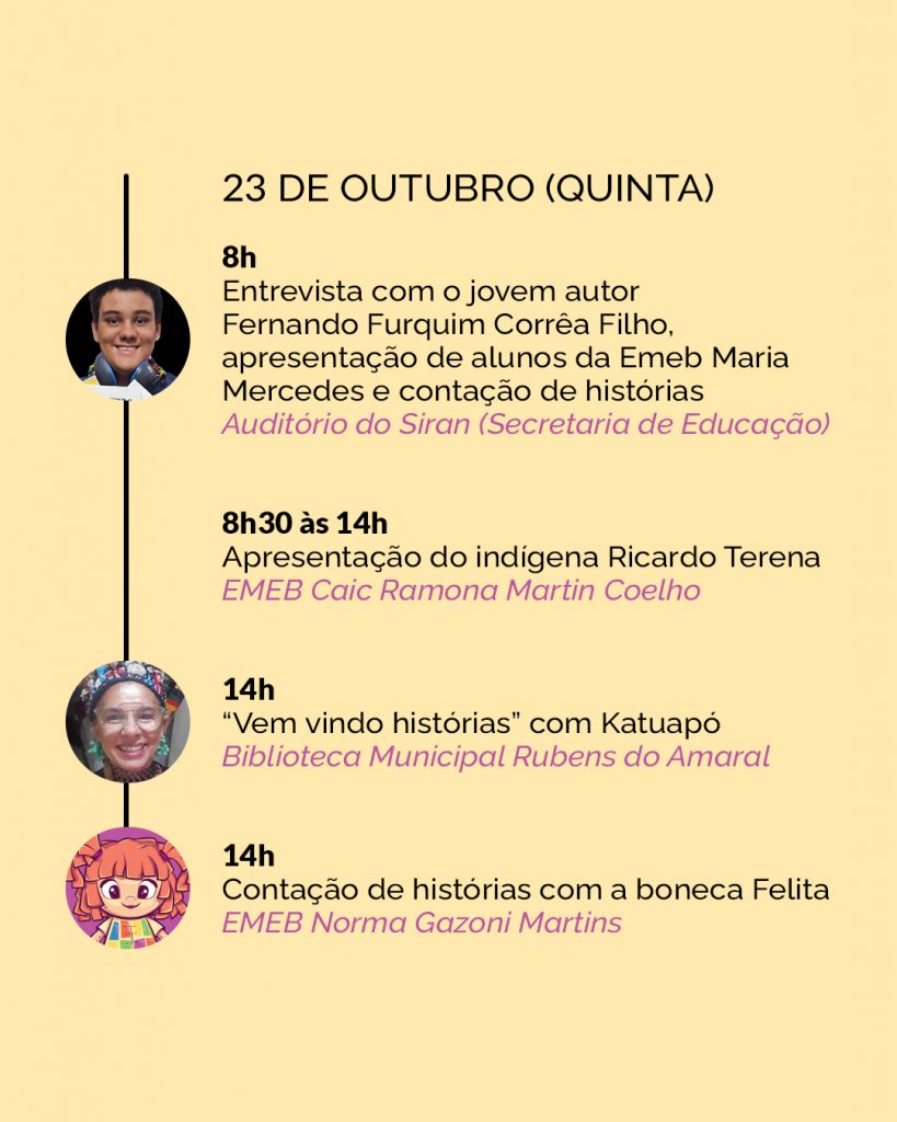 Os alunos da rede municipal de ensino também receberão diversas atividades, como brincadeiras literárias, contação de histórias, sessões de cinema, apresentações musicais e poéticas, encontro com o indígena Ricardo Terena, além da visita da boneca Felita.