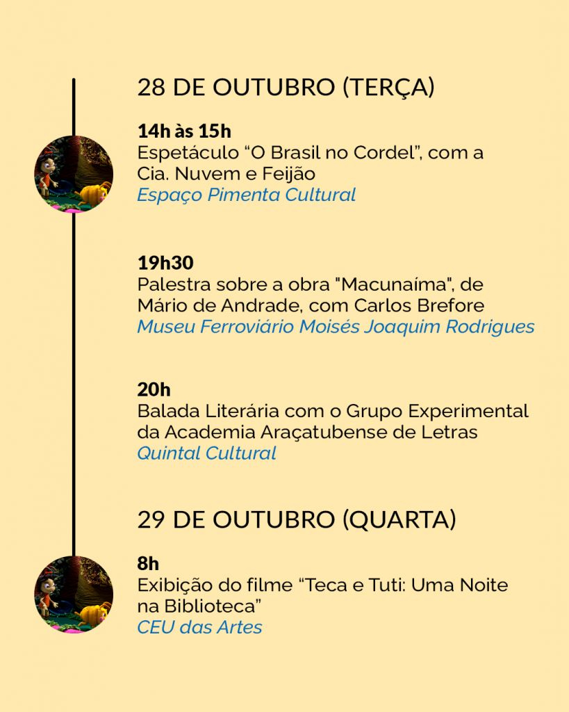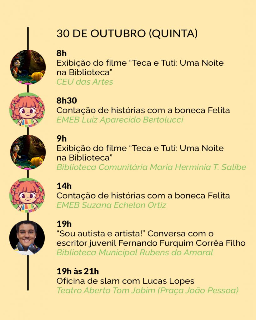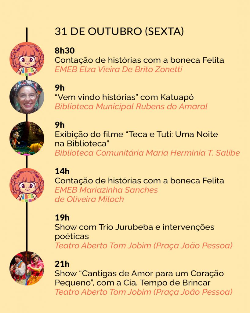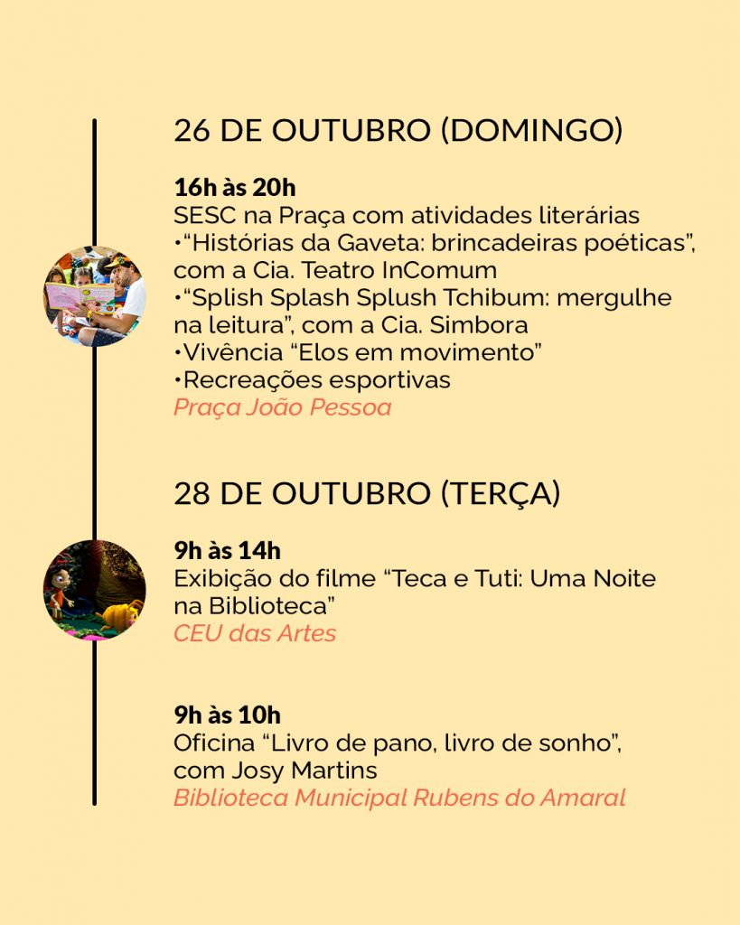 As atrações acontecerão em diversos horários, tendo como protagonista a Biblioteca Municipal Rubens do Amaral. Entre os espaços que sediarão as atividades estão ainda o CEU das Artes, Praça João Pessoa, Biblioteca Comunitária Maria Hermínia T. Salibe, Teatro Castro Alves, entre outros.