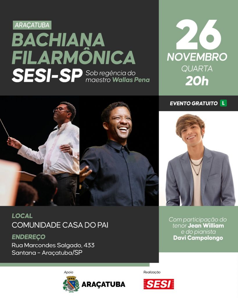 A Orquestra Bachiana Filarmônica Sesi-SP fará uma apresentação exclusiva em Araçatuba, no dia 26 de novembro, às 20h, no salão da Comunidade Casa do Pai, com entrada gratuita. A atração integra a programação cultural de aniversário da cidade, que no dia 2 de dezembro comemora 117 anos.
