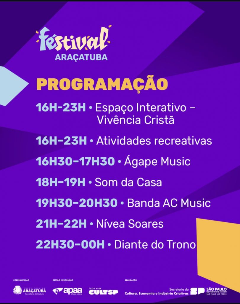O grupo Diante do Trono e a cantora Nívea Soares são algumas das atrações da primeira edição do FÉstival, neste sábado (6), em Araçatuba. Voltado às expressões culturais de origem cristã, o evento terá ainda shows de três das bandas locais: AC Music, O Som da Casa e a Ágape Music.