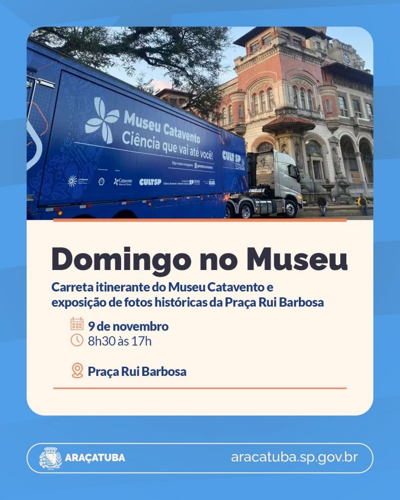A última edição do ano do projeto “Domingo no Museu”, da Secretaria Municipal de Cultura de Araçatuba, contará com uma exposição de fotos históricas na Praça Rui Barbosa, região central da cidade, das 8h30 às 17h, neste domingo (9), na abertura da Carreta do Museu Catavento.