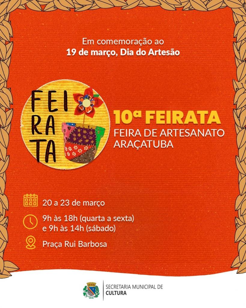 Araçatuba se prepara para celebrar o Dia do Artesão com a décima edição da Feira de Artesanato de Araçatuba (Feirata), organizada pela Secretaria Municipal de Cultura. O evento acontecerá na Praça Rui Barbosa, entre os dias 20 e 23 de março, com horários de funcionamento das 9h às 18h, de quarta a sexta-feira, e das 9h às 14h no sábado. A abertura oficial será no dia 20h, às 17h, com apresentação da Banda Municipal Bruno Zago. Também será comemorado, na oportunidade, o Dia do Artesão.