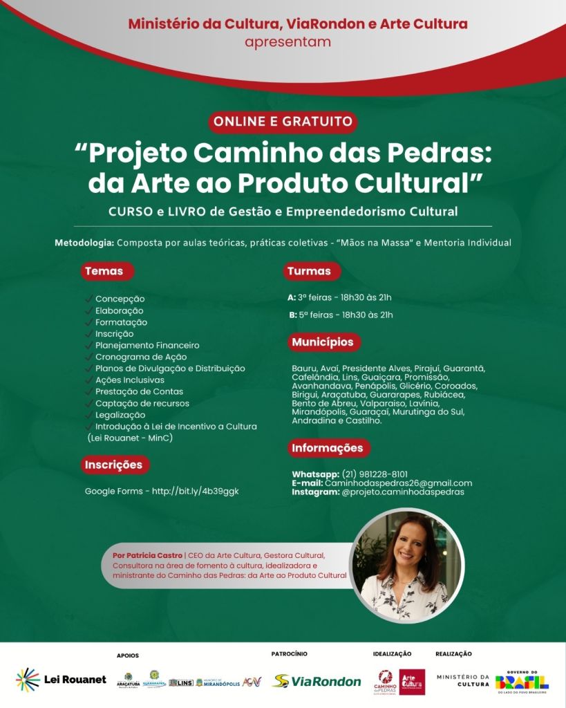 Estão abertas as inscrições para o “Caminho das Pedras: da Arte ao Produto Cultural”, programa gratuito de formação em gestão, produção e empreendedorismo cultural. O curso é destinado a moradores de 25 municípios paulistas, incluindo Araçatuba.