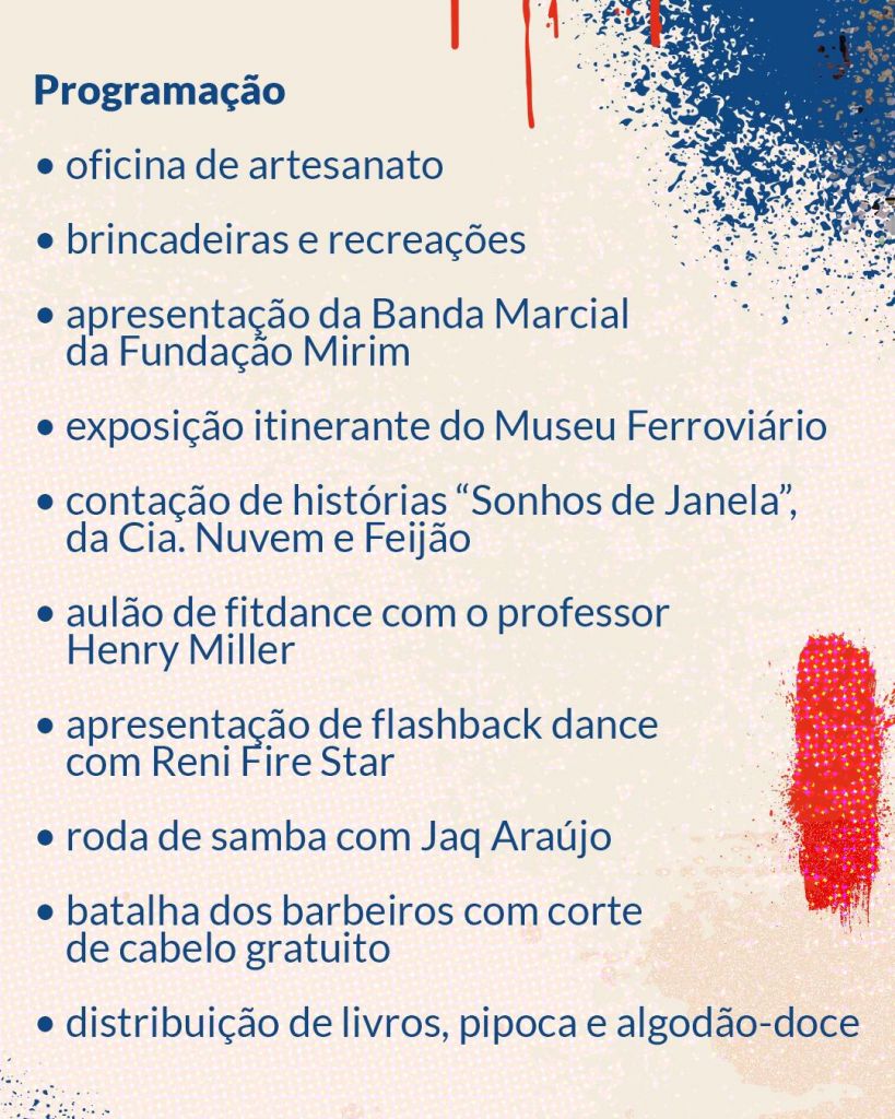 Haverá ainda apresentação da Banda Marcial da Fundação Mirim; contação de histórias “Sonhos de Janela”, com a Cia. Nuvem & Feijão; feira e oficina de artesanatos; aulão de FitDance com o professor Henry Miller; Flashback Dance com Reni Fire Star e roda de samba com Jaq Araújo.