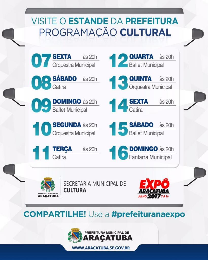 Na 58ª edição da Expô Araçatuba, que começa nesta sexta-feira (7), a Secretaria Municipal da Cultura contará com um espaço no stand da Prefeitura para atendimento ao público e realização de apresentações musicais e de dança.