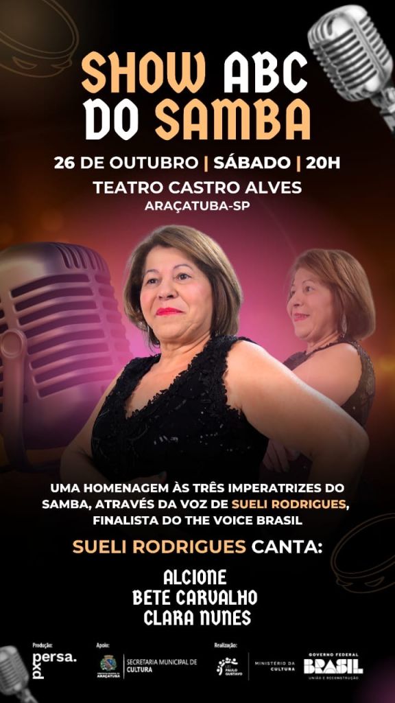 Araçatuba se prepara para uma noite especial no sábado (26), às 20h, com o show "ABC do Samba", estrelado por Sueli Rodrigues, finalista do The Voice Brasil. No palco do Teatro Castro Alves, Sueli irá homenagear três das maiores figuras do samba brasileiro: Alcione, Beth Carvalho e Clara Nunes, com interpretações de grandes sucessos que marcaram época.