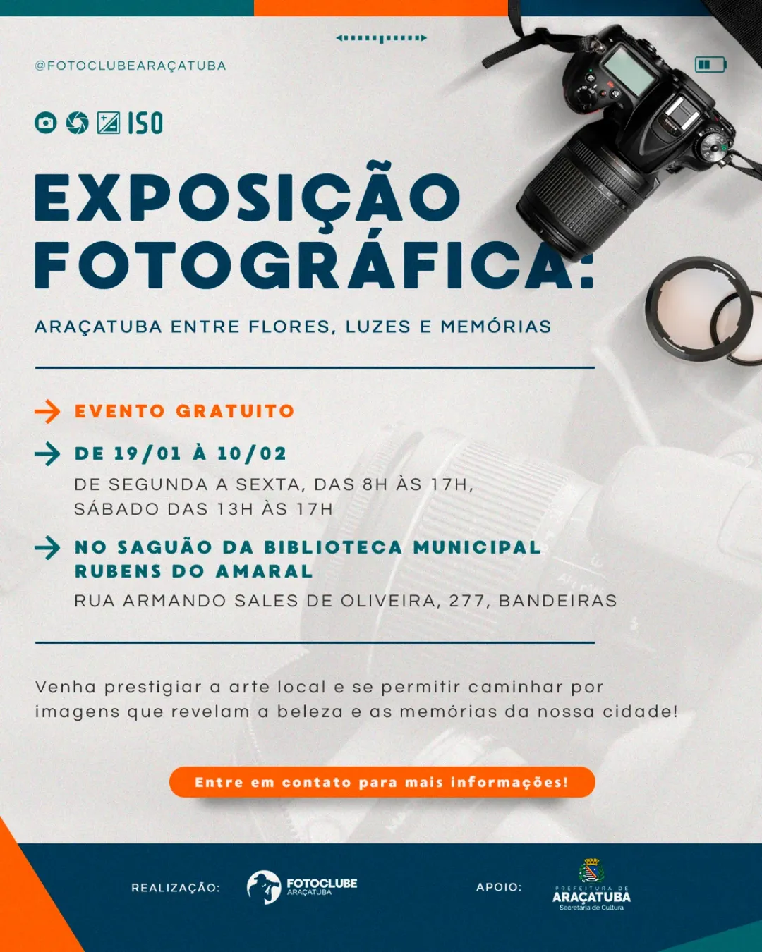 Convidamos você para a exposição "Araçatuba entre Flores, Luzes e Memórias". Uma oportunidade única de caminhar por imagens que revelam a beleza escondida e as histórias da nossa cidade através das lentes do Fotoclube Araçatuba.