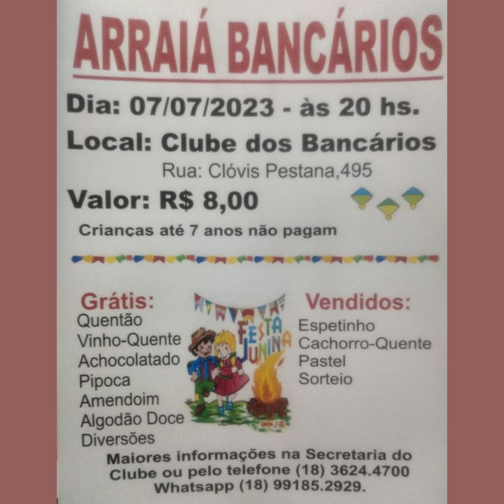 Arraiá Clube dos Bancários Maiores informações na Secretaria do Clube ou pelo telefone (18) 3624-4700 ou whatsapp (18) 99185-2929