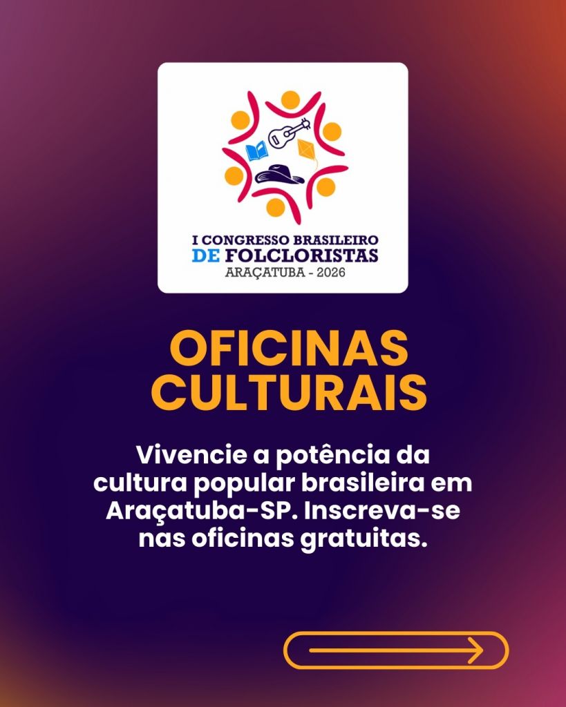 O 1º Congresso Brasileiro de Folcloristas está com inscrições abertas para 12 oficinas culturais gratuitas que levarão o público a vivenciar a potência da cultura popular brasileira. O evento será realizado de 10 a 15 de março, em Araçatuba, reunindo pesquisadores, mestres, artistas e estudiosos.