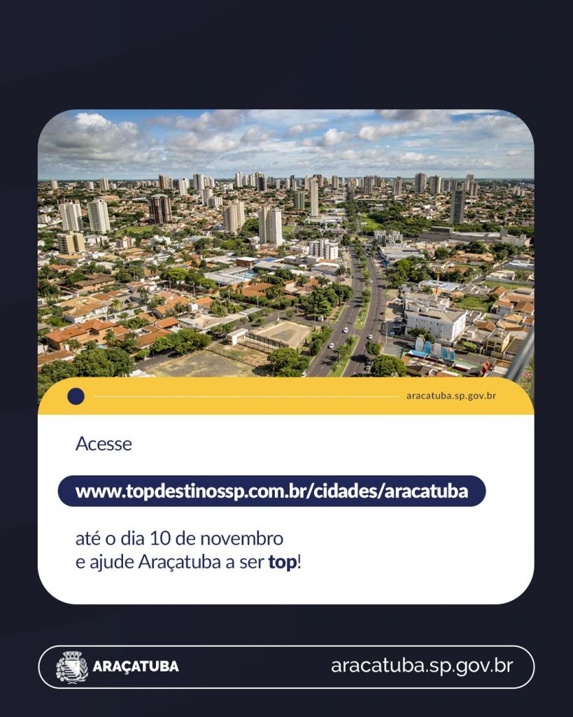 A votação popular está aberta até 10 de novembro no site https://topdestinossp.com.br/cidades/aracatuba/.