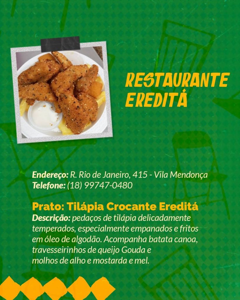Descrição: Pedaços de tilápia delicadamente temperados, especialmente empanados e fritos em óleo de algodão. Acompanha batata canoa, travesseirinhos de Golda e molhos de alho e mostarda e mel.