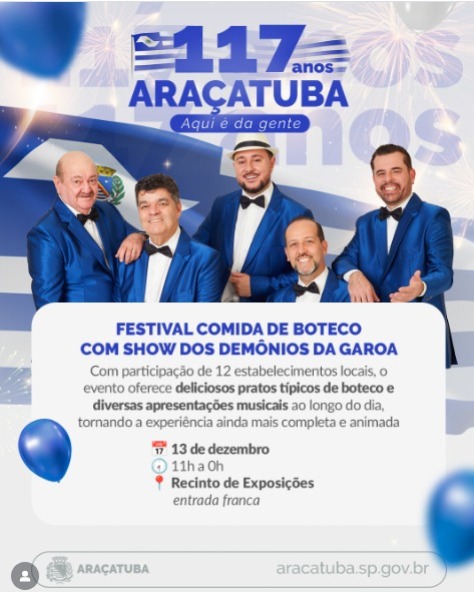 E para deixar essa festa ainda mais inesquecível, a atração principal será nada menos que Demônios da Garoa, o grupo que é sinônimo de história, tradição e música brasileira. Um show emocionante, cheio de clássicos e energia, esperando por você e sua família.